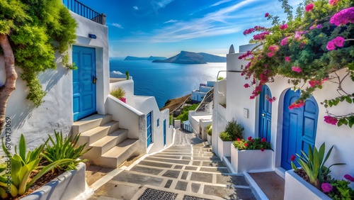 Scenic Greek Island Street with Whitewashed Buildings and Blue Doors