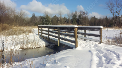 Scenic image capturing a wooden bridge blanketed in snow with a frozen creek below, amidst a tranquil, wintry landscape