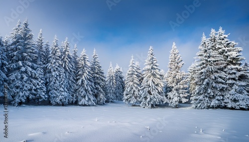 scenic image of snowy fir trees on a frosty day after a heavy snowfall