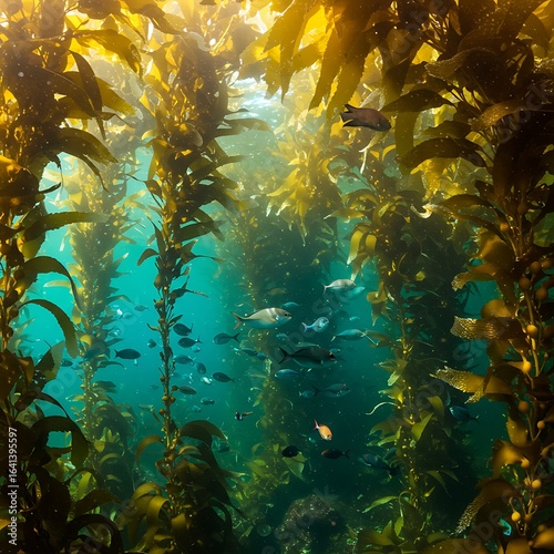 Scenic kelp forest with sunlight rays and fish