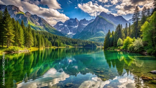 Scenic lake nestled among towering mountains and lush trees, nature, landscape, wilderness, tranquil, secluded, reflection