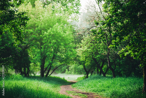 Scenic landscape with beautiful lush green foliage. Footpath under trees in park in early morning in mist. Colorful scenery with pathway among green grass and leafage. Vivid natural green background.