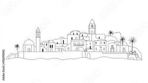 Scenic Line Art of a Coastal Village with Palm Trees and Buildings