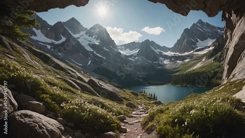 Scenic mountain landscape with a tranquil lake and vibrant greenery under a bright sun