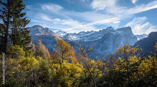 Scenic Mountain Landscape with Autumn Foliage Under a Blue Sky