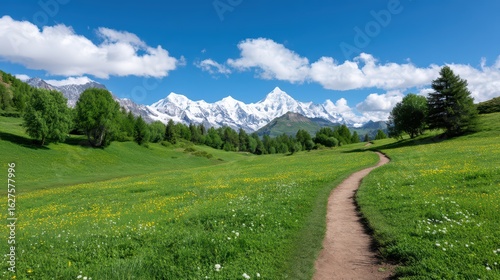 Scenic Mountain Landscape with Lush Green Meadow Pathway