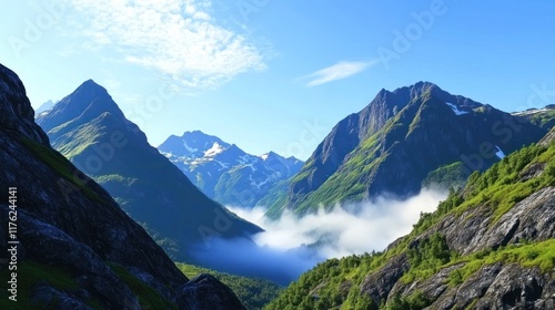 Scenic mountain landscape with lush greenery and misty valley.