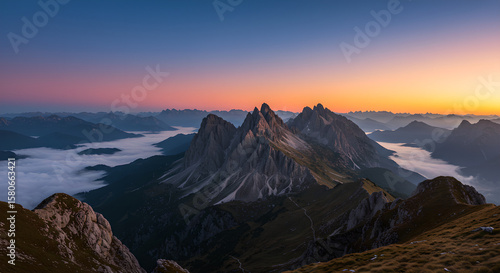 Scenic mountain range at sunrise with orange and blue sky. Clouds forming like a river in the valley below. Natural landscape for design.