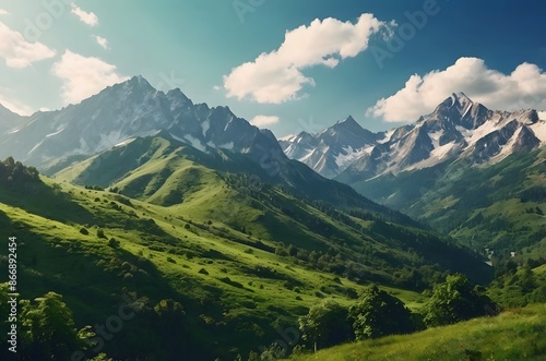 Scenic mountain ranges with lush greenery and blue skies. Summer vacation destination