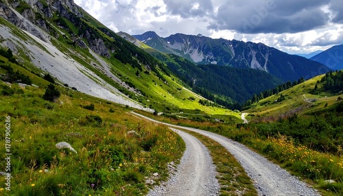Scenic Mountain Road Through Verdant Valley in the Alps.