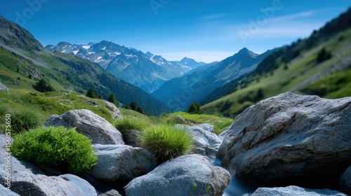 Scenic Mountain Valley Panorama with Green Hills Large Rocks Stream Blue Sky Snow-capped Peaks Nature Landscape