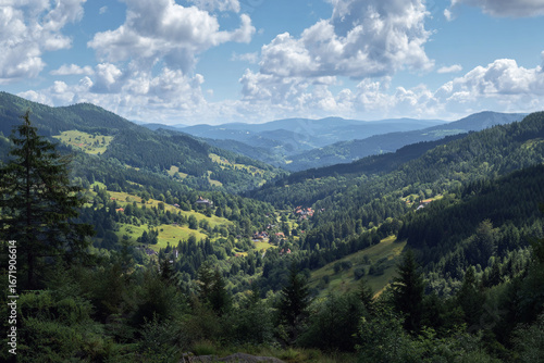 Scenic mountain valley village view lush green forests rolling hills blue sky fluffy clouds