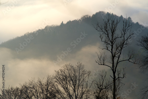 Scenic panorama landscape with waft of mist and freshly harvested field on a sunny autumn day. Photo taken November 12th, 2021, Zurich, Switzerland.