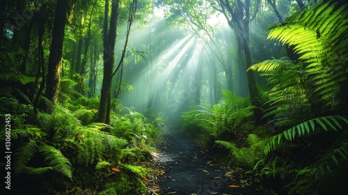 Scenic Pine Forest Path with Green Trees and Lush Vegetation