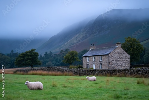 Scenic rural landscape featuring two sheep grazing in a lush green field, with a quaint stone house and misty mountains creating a serene atmosphere