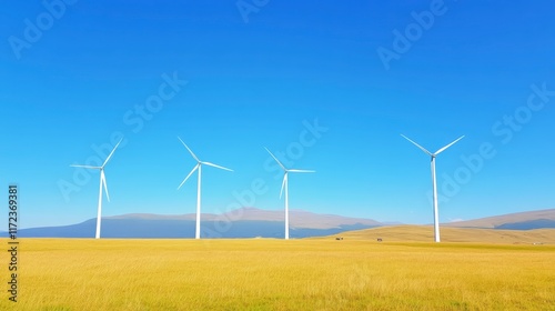 Scenic Rural Landscape with Four Wind Turbines Generating Clean Energy on Sunny Day