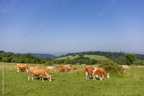 Scenic rural view with cows in a green field, blue sky above, hills and mountains beyond. Classic European countryside and pastoral life