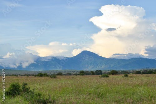 Scenic savannah grassland landscapes against sky in Tsavo National Park, Kenya
