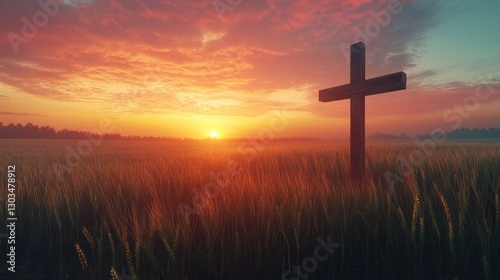 Scenic Sunset Over Wheat Field with Wooden Cross