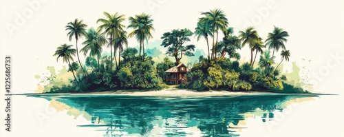 Scenic treehouse on tropical island surrounded by serene water reflections