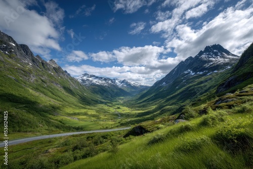 Scenic Valley View of Norway Mountains and Road Under Blue Sky, Representing Tranquility and Environmental Stewardship for Tourism Promotion : Generative AI