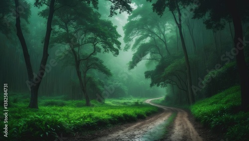 Scenic vibrant green woodland scenery on a rainy day. A trail beneath trees in a dense forest. Colorful landscape with a pathway amid green grass and foliage. Bright natural green backdrop.