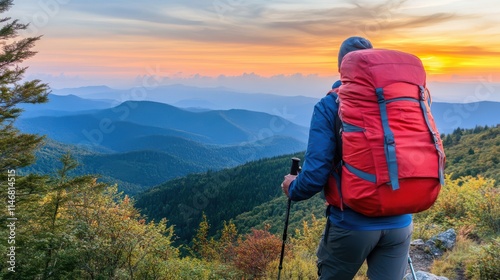 Scenic View of a Hiker with Backpack Overlooking Breathtaking Mountain Landscape During Vibrant Sunset Sky in the Wilderness