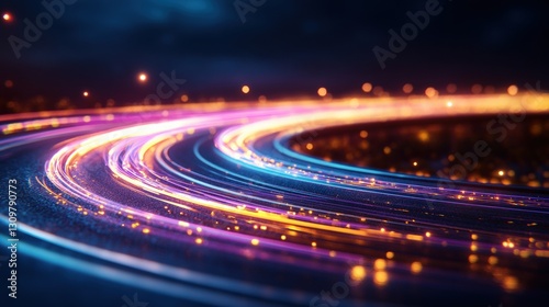 Scenic view of a road at night highlighted by bright lights creating a captivating atmosphere of movement and energy