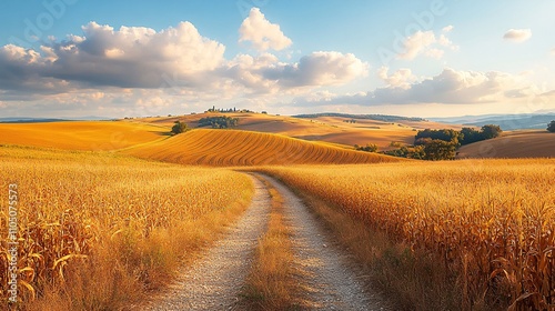 Scenic view of a trail winding through a golden field, framed by cornfields and plowed land, creating an inviting space for text.