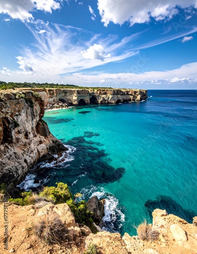 Scenic view of a turquoise sea, cliffs, and blue sky with clouds