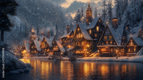 Scenic view of a winter village with glowing lights, peaceful and inviting, highly detailed, calm and natural, warm and idyllic, tranquil and beautiful atmosphere
