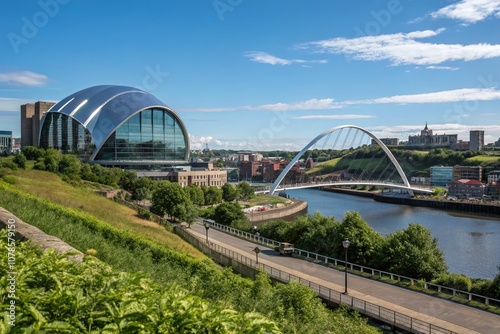 Scenic View of Gateshead, England with Iconic Landmarks, Lush Greenery, and a Bright Blue Sky Perfect for Travel and Tourism Promotion