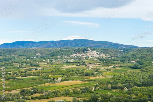 Scenic view of lush green french countryside with distant village in provence