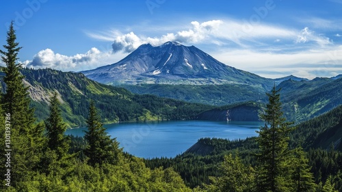 Scenic View of Mount St. Helens from Washington Road Surrounded by Lush Green Forests and a Serene Blue Lake