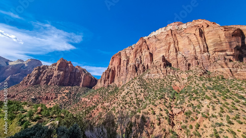 Scenic view of Navajo Sandstone mountain peak Mount Carmel in Zion National Park in Washington County, Utah, United States, USA. Southwest aspect centered, viewed from Springdale. Uninhabited canyon