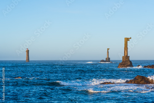 Scenic View of Phare de Nividic Lighthouses Standing Along the Rugged Coastline of Ouessant, Brittany, France with Waves Crashing Against the Rocks