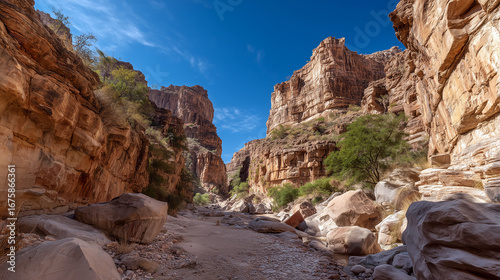 Scenic View of Rocky Desert Canyon with Eroded Cliffs, Boulders, and Sparse Vegetation Under Blue Sky