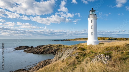 scenic view of solar powered lighthouse on rocky coastline, surrounded by grass and beautiful sky. tranquil atmosphere evokes sense of peace and nature beauty