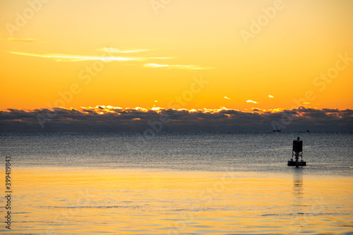 Scenic view of the ocean at sunrise vivid colors with buoy
