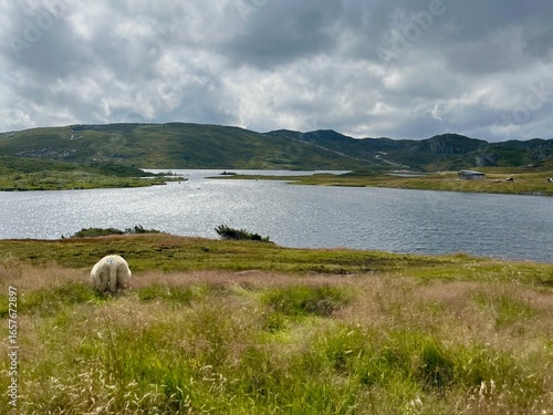 Scenic view of traditional Norwegian summer mountain farms, known as seters, where livestock graze freely during the warmer months.