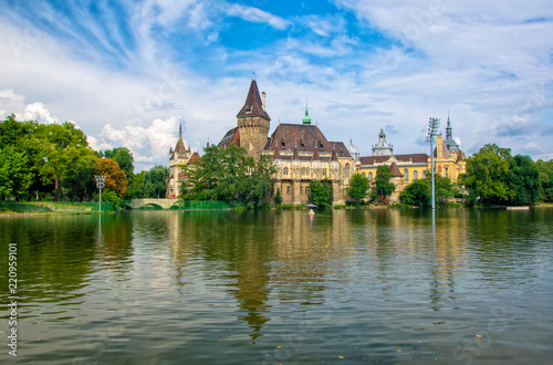 Scenic view of Vajdahunyad Castle reflected in the lake under the picturesque sky in main City Park, Budapest, Hungary