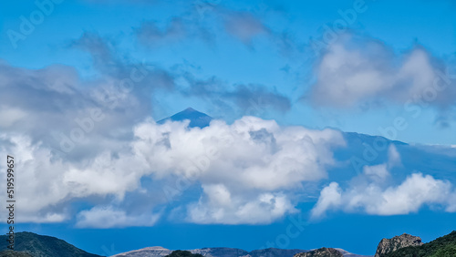 Scenic view on the cloud covered volcano mountain peak Pico del Teide on Tenerife seen from La Gomera, Canary Islands, Spain, Europe. Mystical magical atmosphere on hiking trail to Roque de Agando