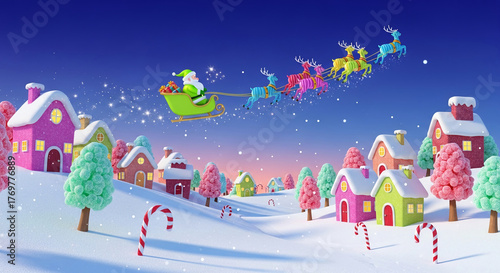 Scenic view with colorful houses, reindeer, sleigh, and santa claus. Symbolizes winter holiday, happiness and festive atmosphere, suitable for seasonal.
