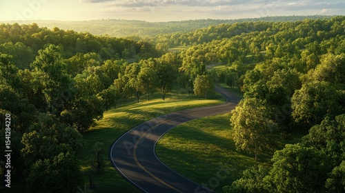 Scenic winding road through lush green forest landscape under sunny sky du daytime