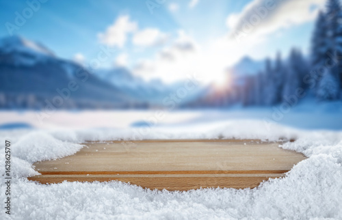 Scenic winter landscape with snow-covered peaceful and quiet forest and mountain area. Snow surface with clean, minimal space for placing product, text, or logo.