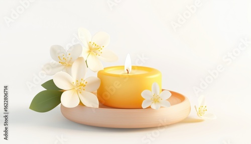 Scented Candle And Flower For Spa, Aromatherapy, Relaxation, Wellness, Meditation Therapy, Fragrance, Decoration, And Beauty - Enhancing Your Atmosphere With Natural Elements.
