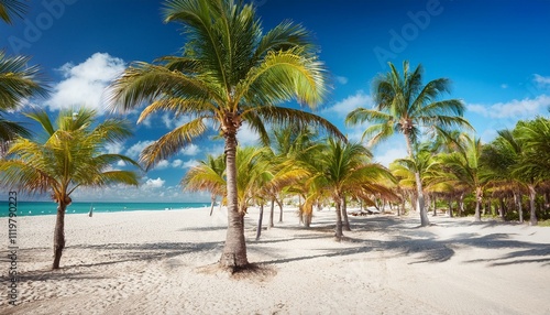 Schattenspendende Palmen an einem wunderschönen Sandstrand mit Blick aufs Meer. Urlaubshintergrund.