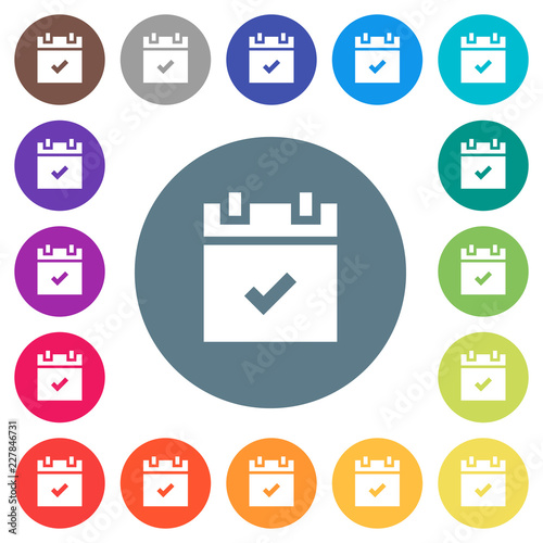 Schedule done flat white icons on round color backgrounds