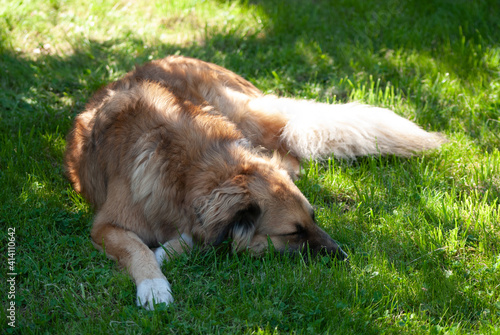 schlafender brauner wuscheliger Hund, liegend auf einer grünen Wiese im Schatten