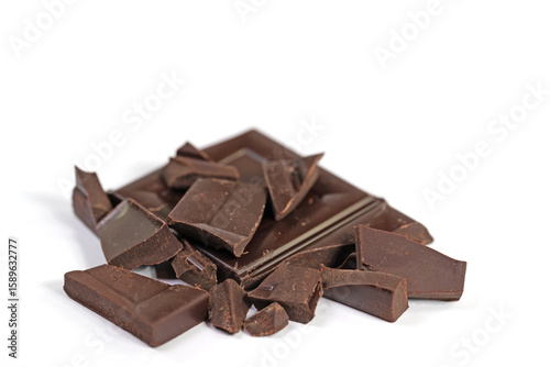 Schokoladenstücke vor weißem Hintergrund in einer Nahaufnahme